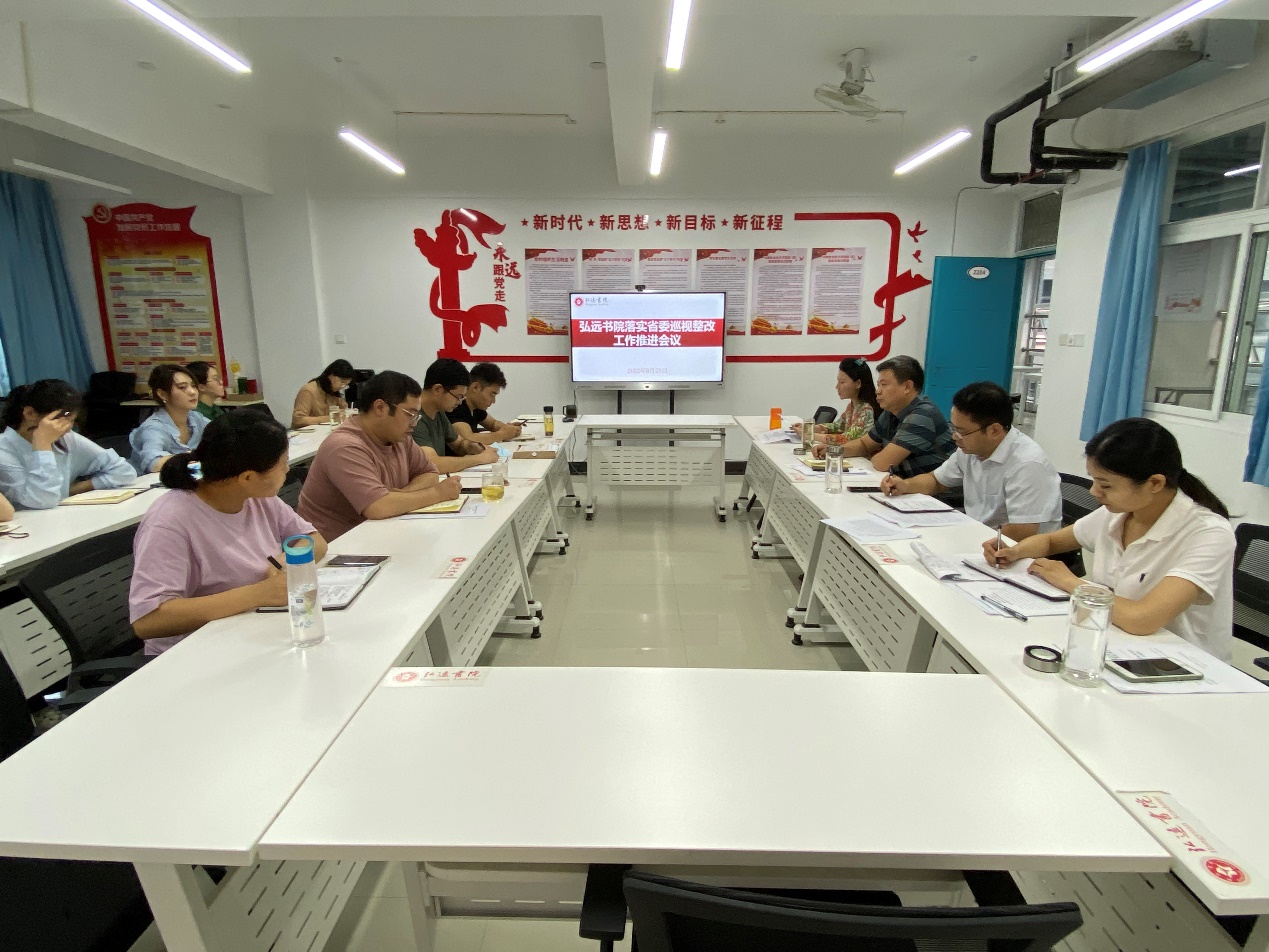 会上,周倩传达了《弘远书院党委关于落实十一届省委第一轮巡视组反馈意见的整改方案》和《弘远书院落实十一届省委第一轮巡视组反馈意见整改台账》。
